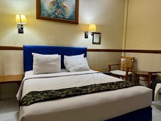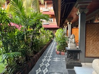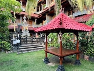 Na veel gezoek tussen de honderden taxichauffeurs en drivers vind ik eindelijk de taxi die ik via Booking had besteld. Dat was dus wel goed geregeld. En dan de drukte van het Indonesische verkeer in. Ben blij dat ik niet zelf rijd. Na een ritje van 3 kwartier wordt ik bij het hotel Sorga Cottages afgeleverd en kan ik mijn kamer in. Het is een prima kamer direct aan het zwembad.