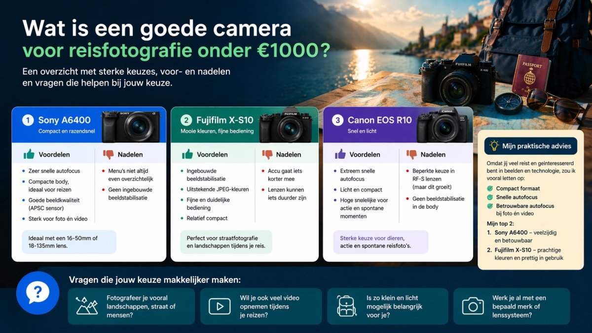 Ik vroeg dus aan ChatGPT:Stel dat je mij gewoon deze vraag zou stellen: “Wat is een goede camera voor reisfotografie onder €1000?”