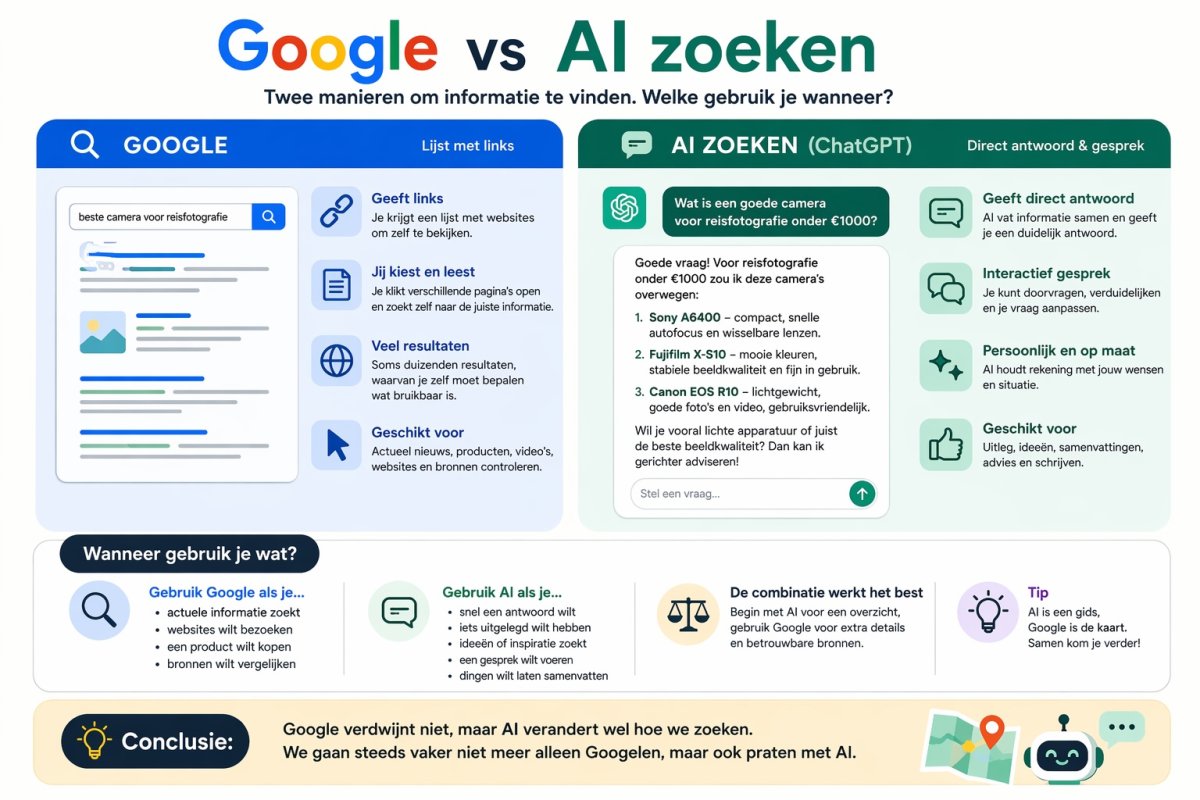 Ik merk dat zelf ook. Als ik bijvoorbeeld wil weten: “Hoe kan ik een boek maken met AI-beelden?” Dan vraag ik dat eerst aan AI. Pas daarna zoek ik eventueel extra voorbeelden via Google. AI wordt dus steeds vaker de eerste stap.