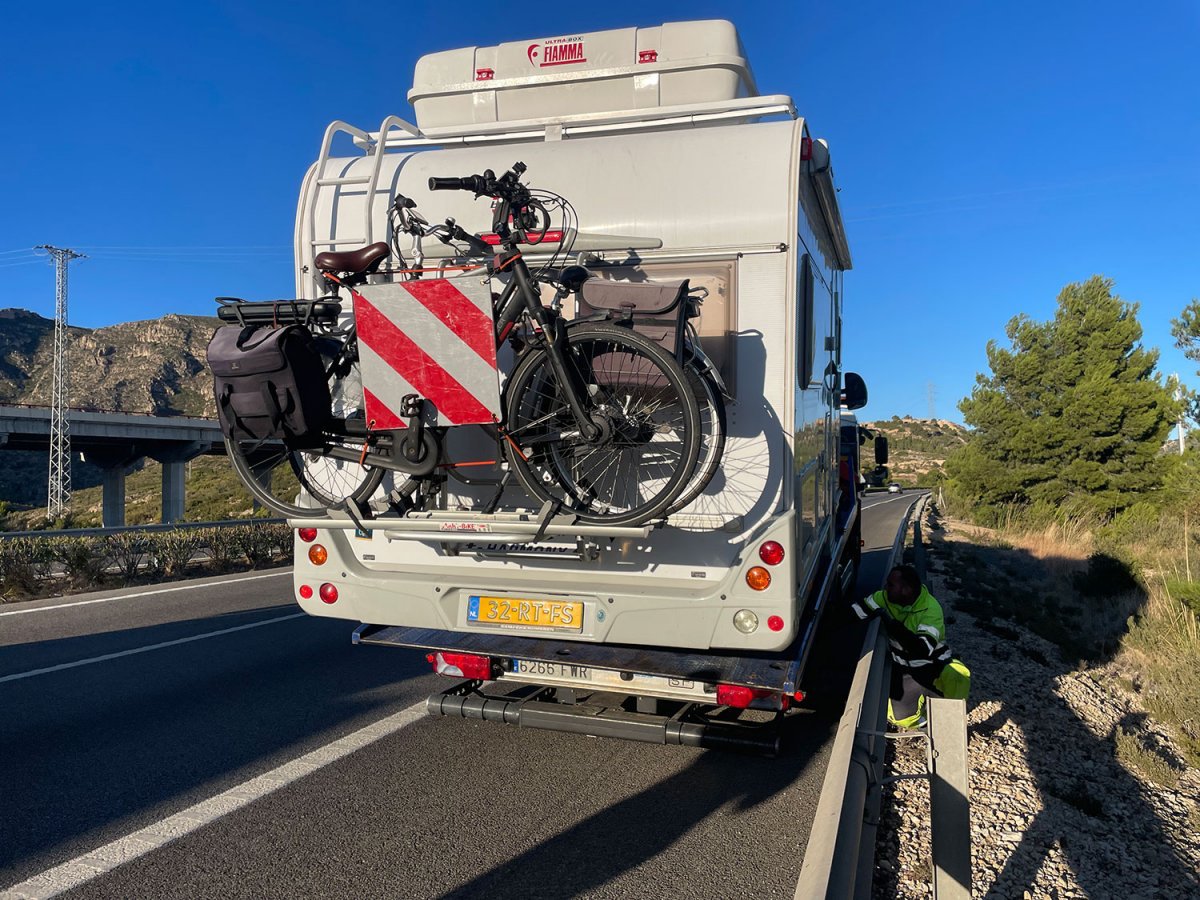 We zijn lid van de ANWB en alle lof voor deze organisatie. Het blijkt dat we een camper supplement op onze standaard ANWB kaart hebben afgesloten. Was ik helemaal vergeten. Welliswaar liet de uitvoering hier in Spanje op zich wachten, want na pas 2 uur kwam een sleepwagen en werden wij naar hun basis gesleept. Ja hoor het is zaterdag en de sleepdienst is alleen maar sleepdienst, geen reparateur. Dat wordt maandag.