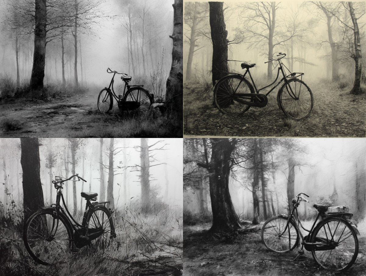“Een zwart-wit tekening van een oude fiets in een mistig bos.”
