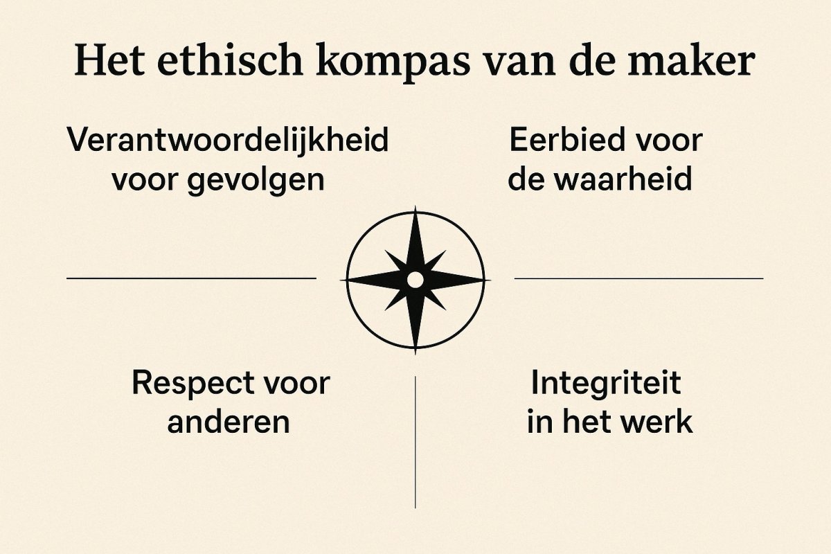 Dat heb ik verwerkt in een visuele afbeelding: “Het ethisch kompas van de maker”. Niet omdat ik de wijsheid in pacht heb, maar omdat ik ergens wil staan. En omdat ik denk dat iedereen die met AI werkt – of met creatieve middelen überhaupt – zichzelf die vragen moet stellen.